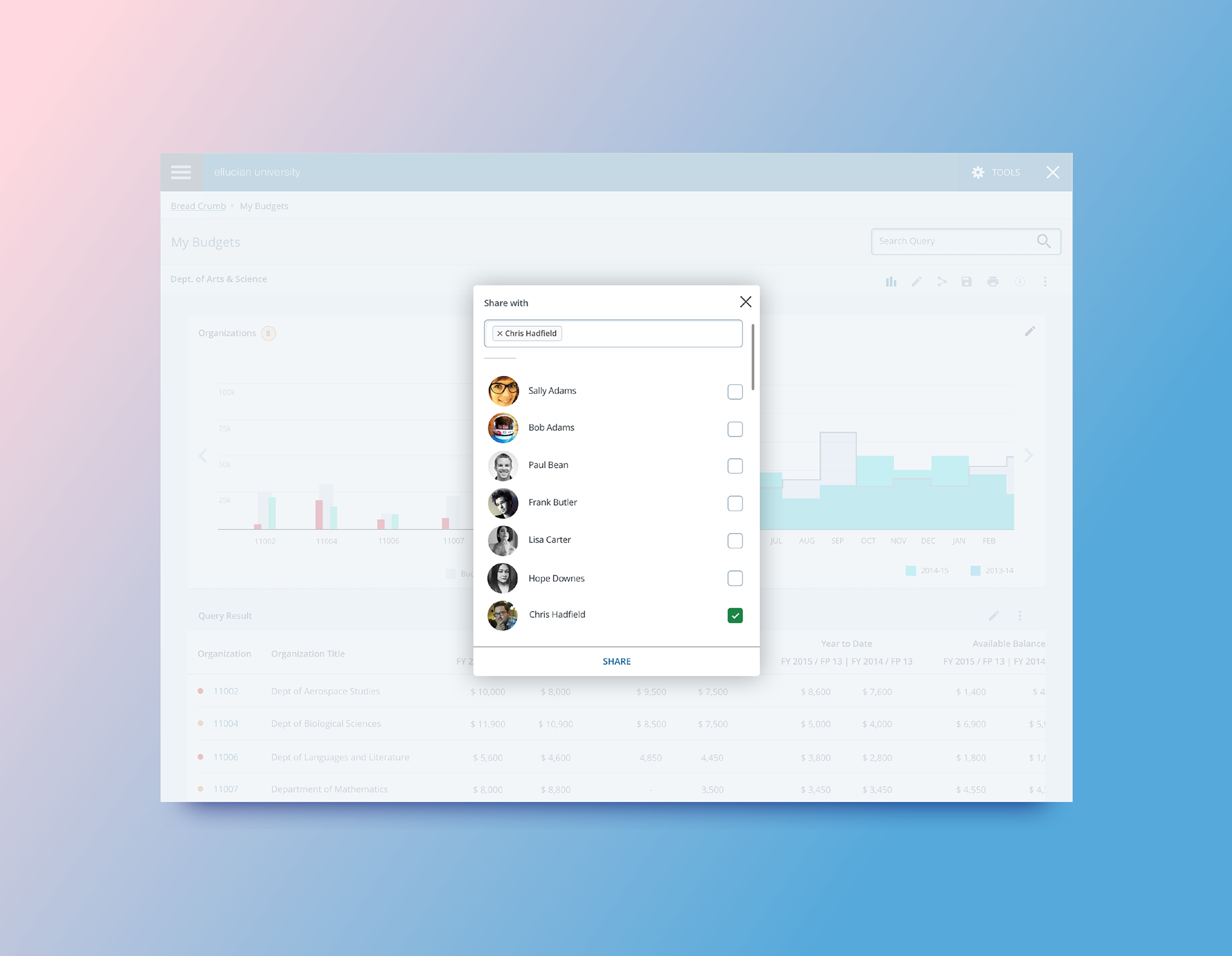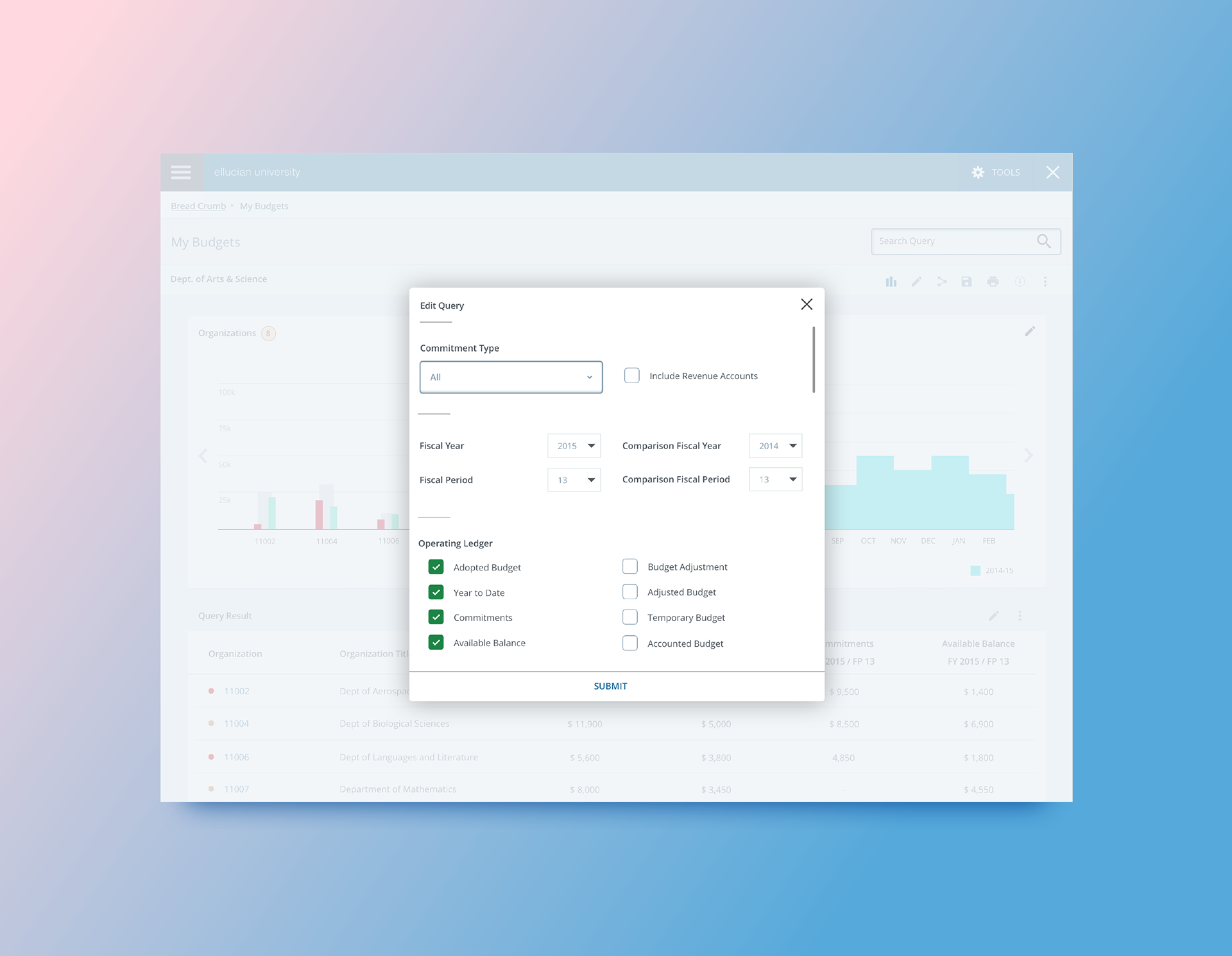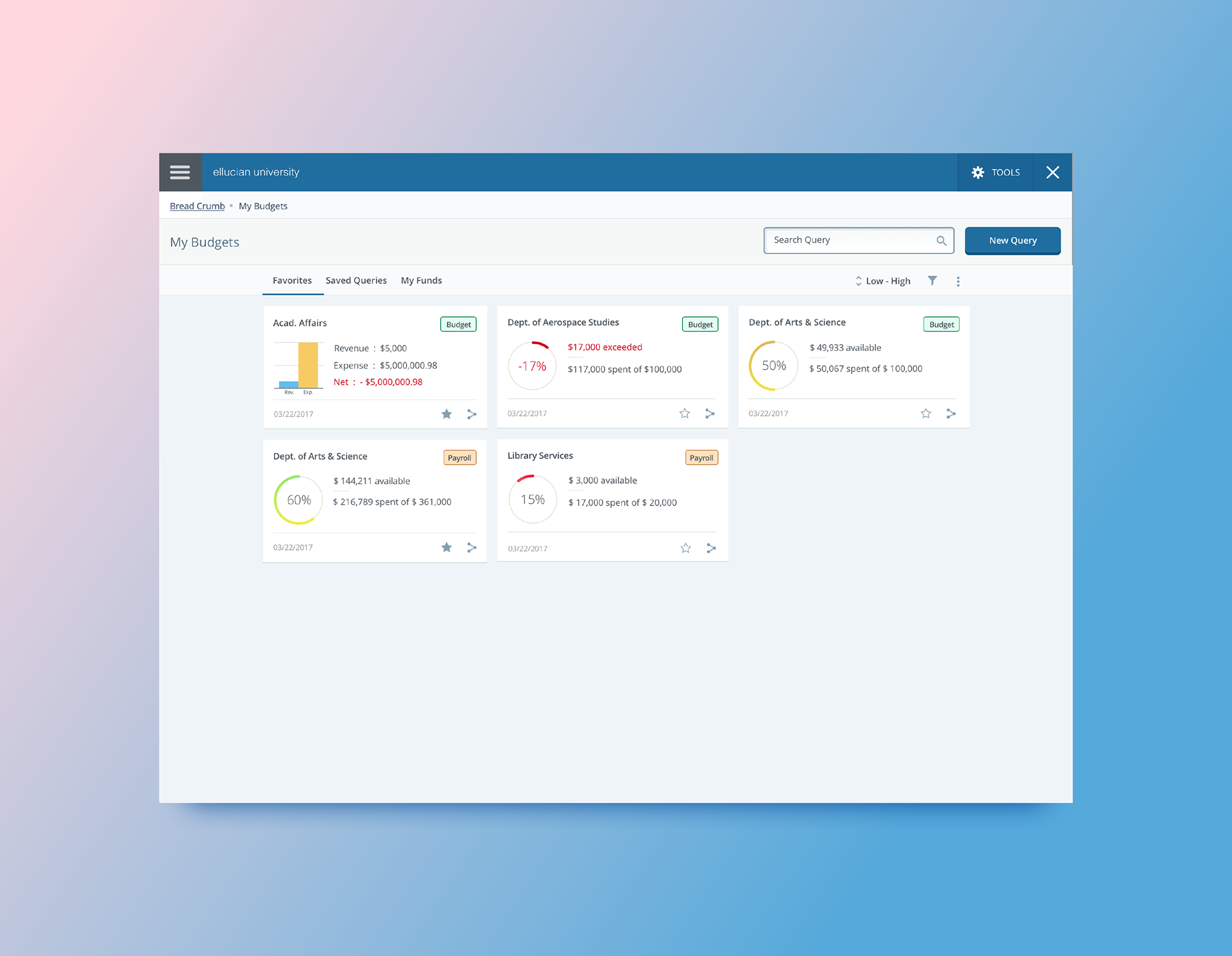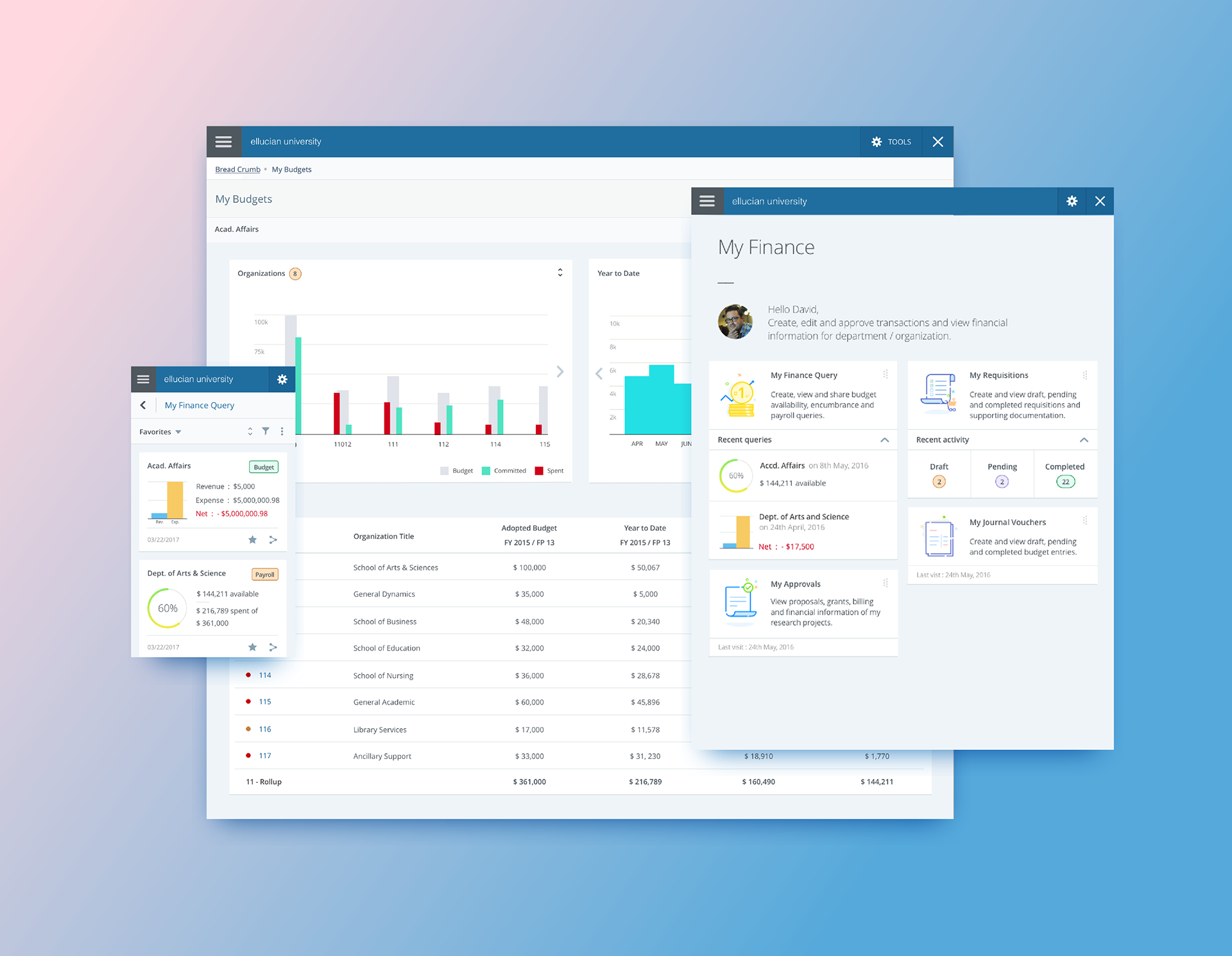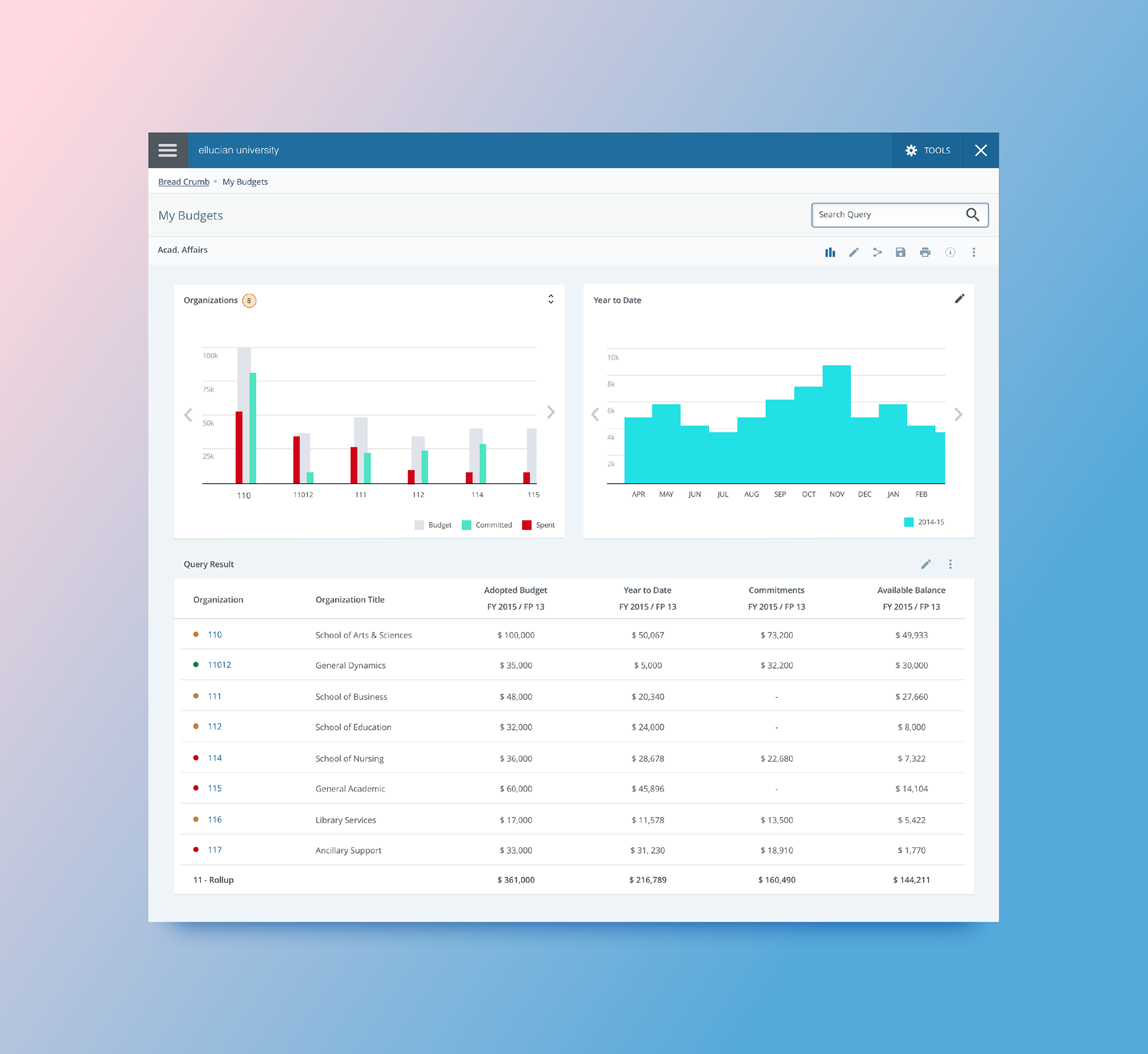 Banner My Finance Query provides an enhanced user experience to view remaining balance for easier financial management. Adds quick views of spend analysis through graphics and dashboards. Allows drill-down capability from summary to document level including attachments. Leverages embedded reporting to make better business decisions. It allows the user to compare financial data across user defined time-frames by providing the ability to configure views of preferred funding elements. My Finance leverages existing Banner database for historical trend analysis with RWD for cross platform compatibility.